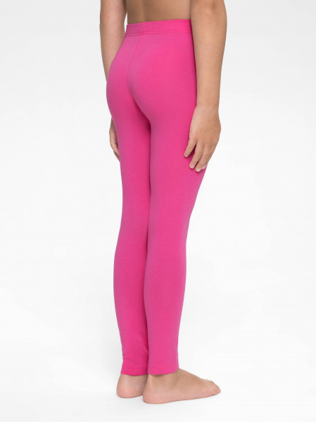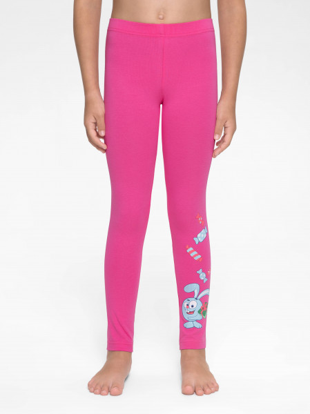 Легинсы для девочки из однотонного трикотажного полотна. Без боковых швов. Верх изделия обработан эластичной тесьмой швом в подгибку. По переду, по низу легинсов на участке печати нанесен рисунок "смешарики".