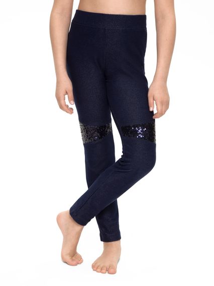 Легинсы для девочки из трикотажного полотна. По переднему шву отрезная деталь из отделочного полотна с пайетками. Верхний срез изделия обработан поясом с эластичной тесьмой внутри для регулировки обхвата талии. Пояс регулируется пуговицей пришитой с и
