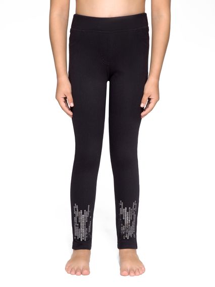 Легинсы для девочки из однотонного трикотажного полотна. По переду имитация боковых карманов и гульфика, по спинке - накладные карманы. Верх изделия обработан притачным поясом с эластичной тесьмой внутри. Низ переда оформлен пайетками.
