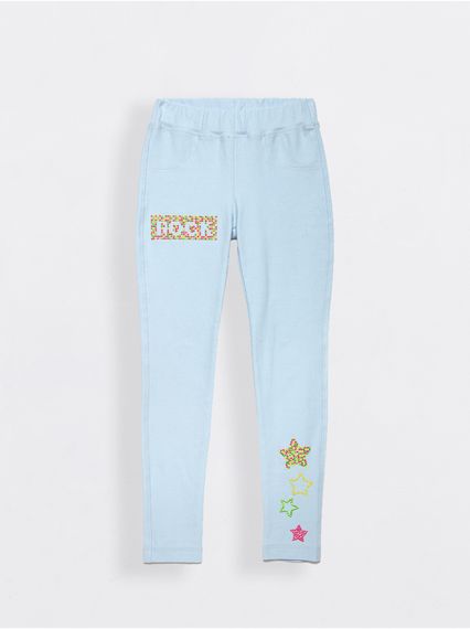 Легинсы для девочки из однотонного трикотажного полотна. По переду имитация боковых карманов, по спинке настрочены два накладных кармана. Верх изделия обработан притачным поясом с эластичной тесьмой внутри. По передним половинкам нанесен рисунок на участк