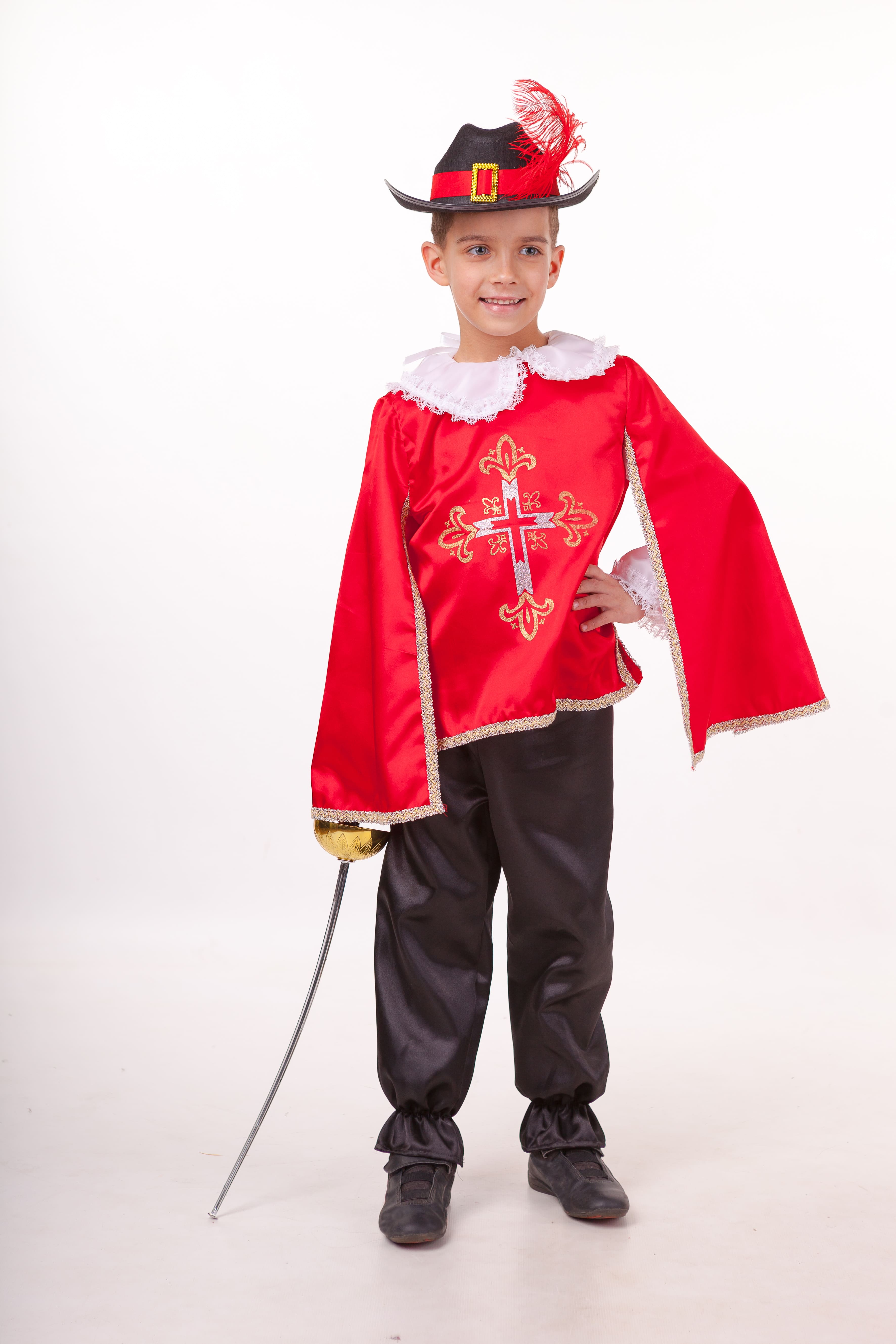 Карнавальный костюм Мушкетер выполнен в традиционом его представлении. Шляпа с полями украшена пером, Рубашка с белоснежными рукавами фонариками прекрасно сочетается с плащом . Брюки классического черного цвета и шпага дополняют образ мушкетера., полиэстр