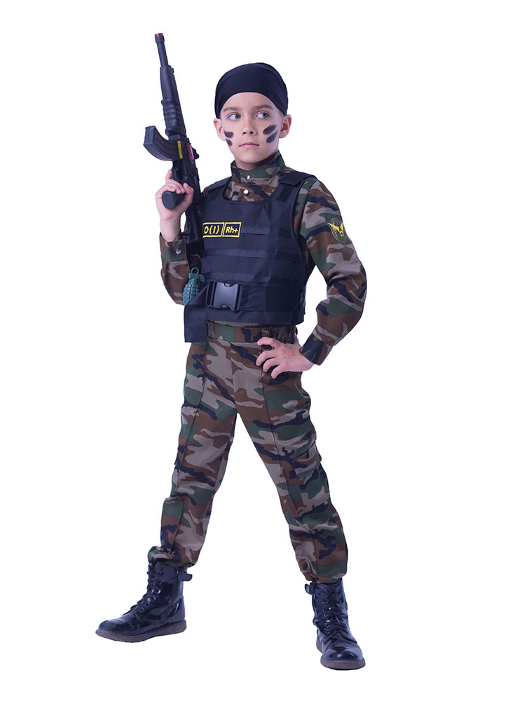 Костюм военной тематики "Спецназ" для мальчиков. Отличное приобретение к 23 февраля, дню ОМОНа. Поздравьте своих защитников: пап и дедушек с их главными праздниками! Мальчикам очень понравится, что в комплект костюма входит автомат, бандана и бронежилет. Остальная комплектация - рубашка и брюки. На бронежилете нашивка с группой крови. Бронежилет регулируется по размеру.