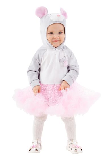 Карнавальный костюм Мышка для самых маленьких девочек станет отличным вариантом наряда на тематическую фотосессию или первую новогоднюю елку. Красивый и милый наряд из 100%-ного хлопка выполнен в серо-розовых тонах. Костюм представляет собой комбинезон-боди на молнии с вшитой юбочкой.