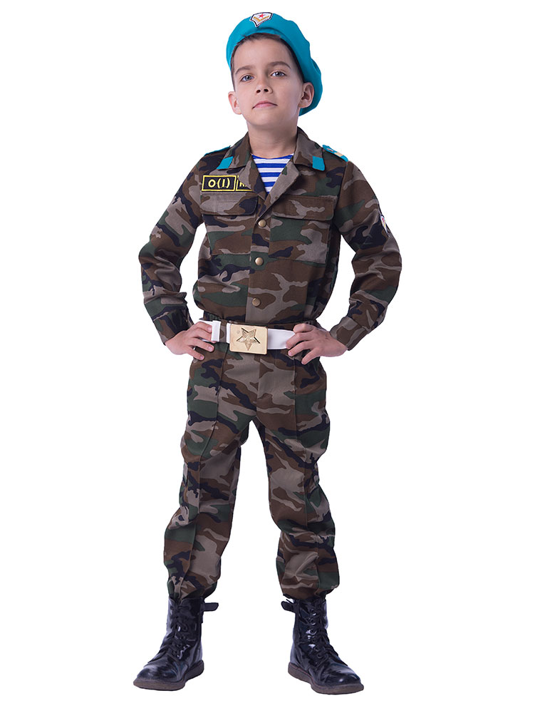Костюм Десантника для мальчика - отличный вариант костюмированной военной формы РФ, в котором можно отметить 23 февраля или день Десантника. В комплект костюма входит рубашка, брюки, тельняшка, берет, ремень.