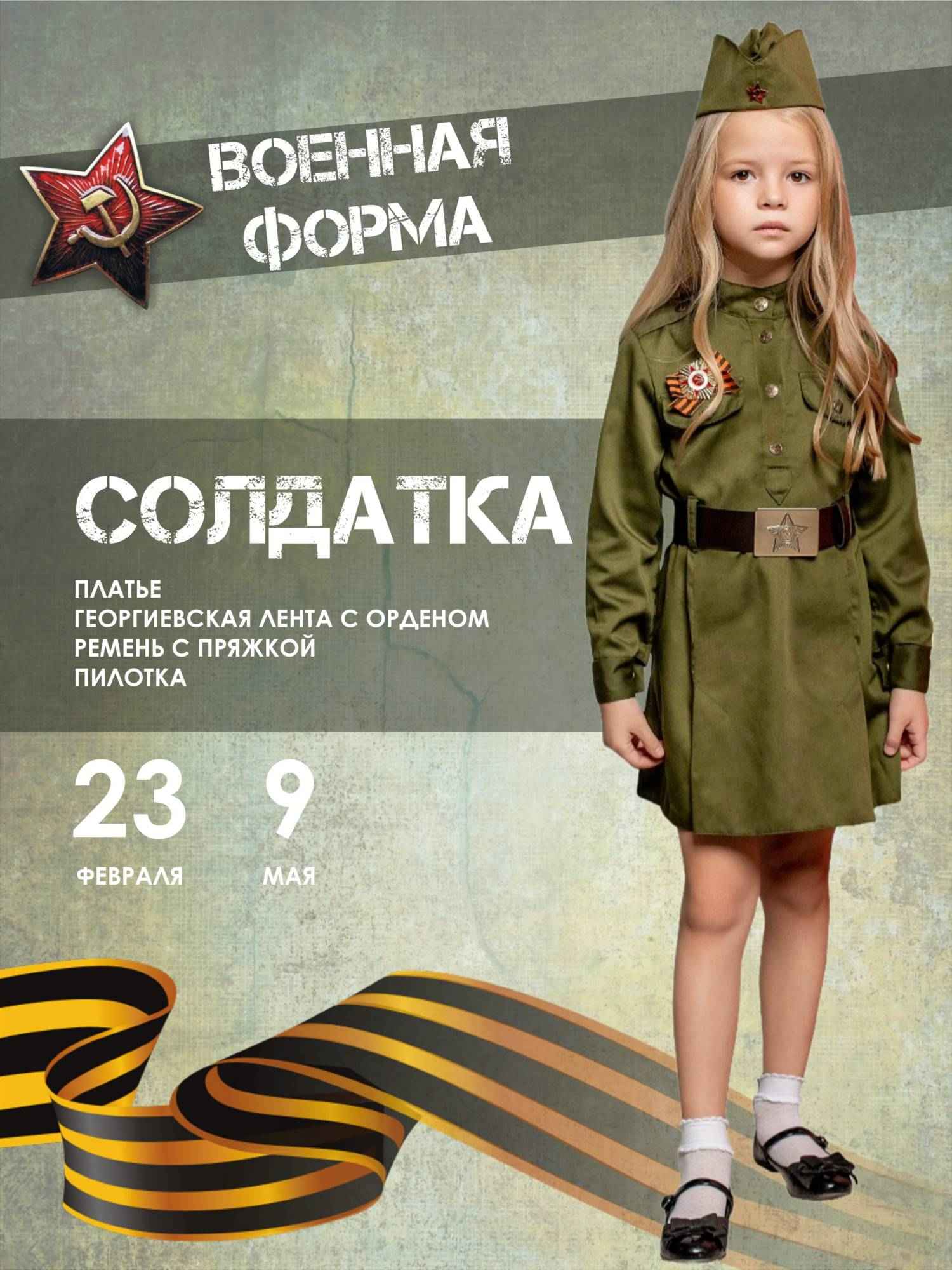 Костюм Солдатка создан для девочек, которые ни в чем не хотят отставать от мальчиков. В таком образе можно трогательно поздравить ветеранов на 9 мая, устроить представление для папы или дедушки на 23 февраля, поучаствовать в спектакле на военную тему. В комплект образа входит платье, пилотка, ремень, георгиевская лента.