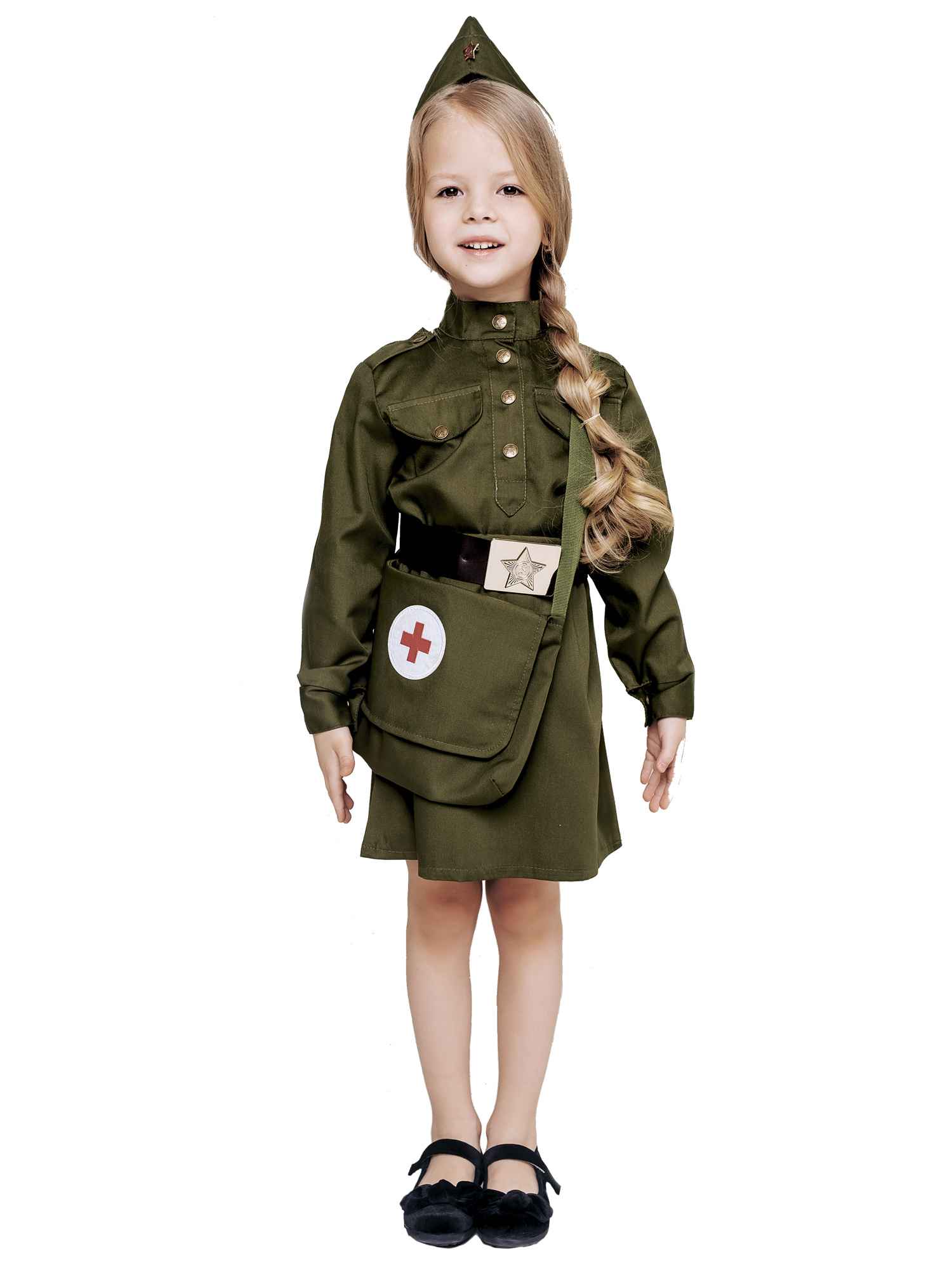 Костюм Военная Медсестра для девочек к праздникам 9 мая и 23 февраля представлен в широком ассортименте размеров от 4-х до 12 лет. В комплекте образа гимнастерка, юбка, пилотка, сумка и ремень.