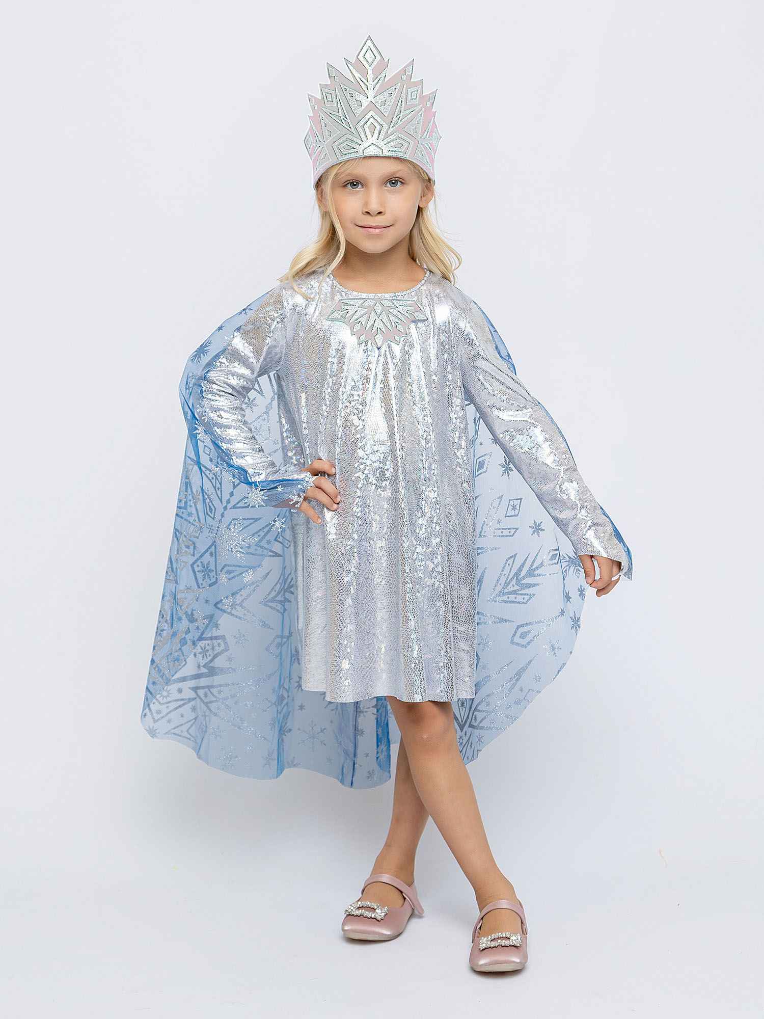 Карнавальный костюм для девочки Льдинка. В комплекте серебристое платье с накидкой и блестящая корона. Чудесное праздничное платье может стать лучшим подарком маленькой девочке на Новый год и другие праздники.