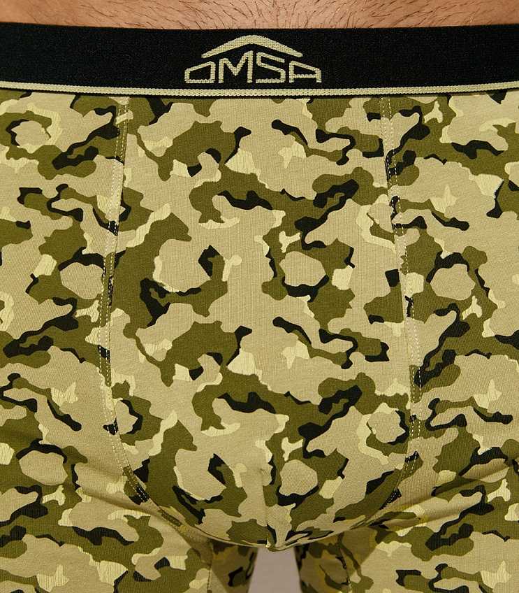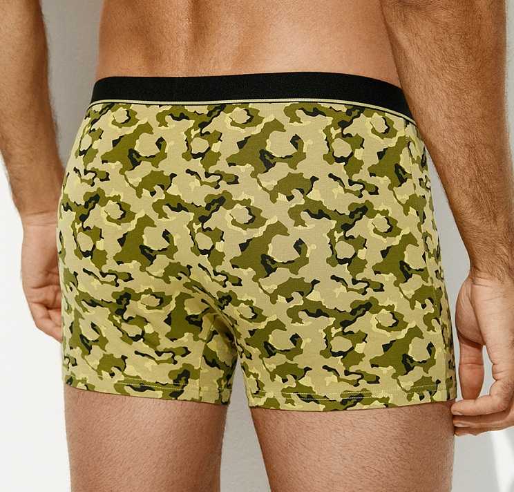 Мужские трусы - боксеры со средней линией талии, открытой брендированной резинкой и актуальным принтом. Изготовлены из высококачественного мягкого хлопка, который отлично пропускает воздух, приятно ощущается на теле и подходит даже для чувствительной кожи. Эластан в составе обеспечивает идеальное облегание. Комфортные боксеры с принтом в стиле милитари не только подчёркивают характер, но и добавляют акцент в повседневный образ. Идеальны в роли стильного подарка — практичного, модного и с настроением.