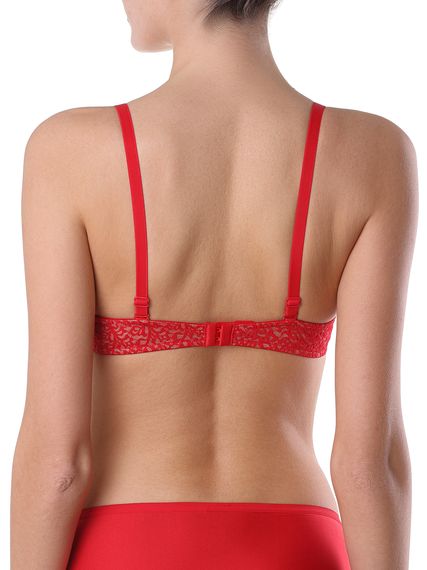 Бюстгальтер из эластичного кружевного полотна. Детали стана на подкладке из эластичного сетчатого трикотажного полотна. Чашки формованные, на каркасах. Бретели съёмные сзади, регулируются по длине. Застежка на крючки и петли сзади.