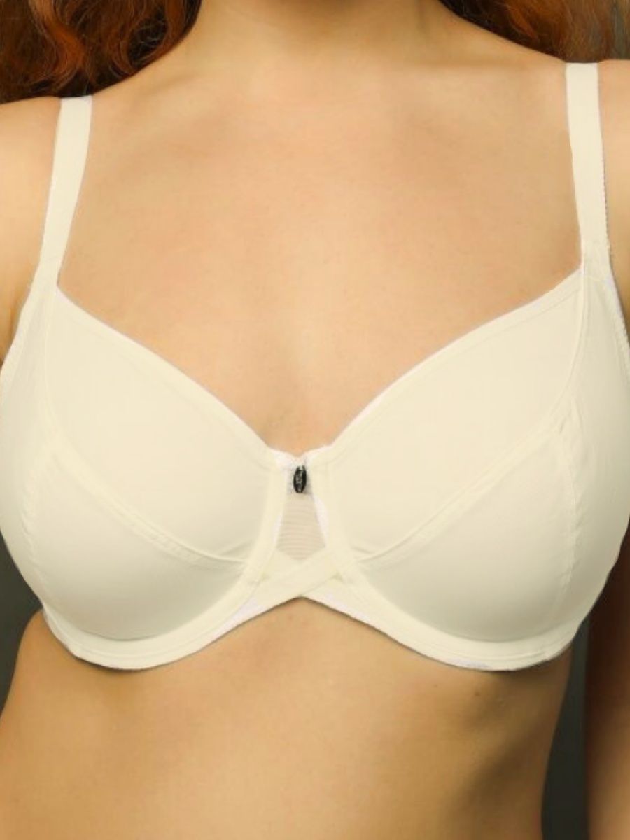 Выполнен из эластичного трикотажного полотна. Бюстгальтер с мягкими чашками на каркасе, членение чашек - тройное диагональное. Такая конструкция, обеспечивают высокую степень поддержки за счет нижней детали чашки, которая выполняет корректирующую функцию – приподнимает, собирает с боков, центрирует грудь, создает округлую форму. Четырехрядная застежка дает возможность идеально отрегулировать объем бюстгальтера. Ширина бретельной ленты и боковых деталей стана изменяется в зависимости от размера. Чем больше размер, тем шире бретель и боковые детали.