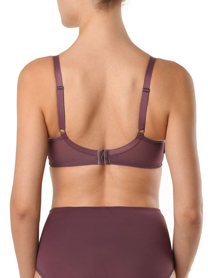 Бюстгальтер из эластичного полотна, неэластичного полотна и эластичного кружева. Чашки мягкие на каркасах, по верхним краям чашек настрочено эластичное кружево. Бретели регулируются по длине сзади. Застежка на крючки и петли сзади.