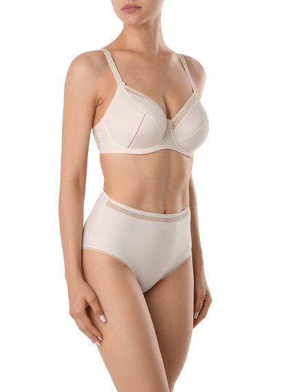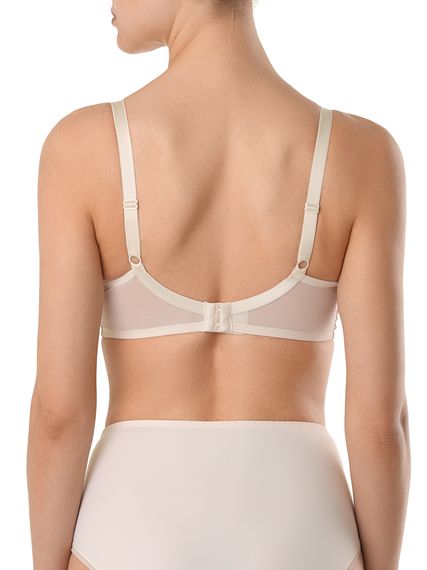 Бюстгальтер из эластичного полотна, неэластичного полотна и эластичного кружева. Чашки мягкие на каркасах, по верхним краям чашек настрочено эластичное кружево. Бретели регулируются по длине сзади. Застежка на крючки и петли сзади.