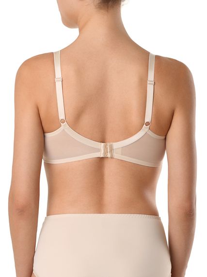 Бюстгальтер из эластичного полотна, неэластичного полотна и эластичного кружева. Чашки мягкие на каркасах, по верхним краям чашек настрочено эластичное кружево. Бретели регулируются по длине сзади. Застежка на крючки и петли сзади.
