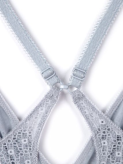 Бюстгальтер из эластичного кружевного полотна. Детали стана и чашек на подкладке из эластичного сетчатого полотна.