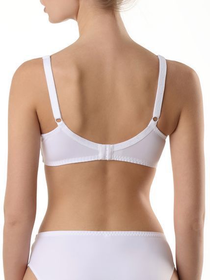 Бюстгальтер из эластичного трикотажного полотна, неэластичного трикотажного полотна и эластичного кружева. Детали чашек на подкладке из дублированного трикотажного материала, деталь ластовицы на подкладке из неэластичного трикотажного полотна.