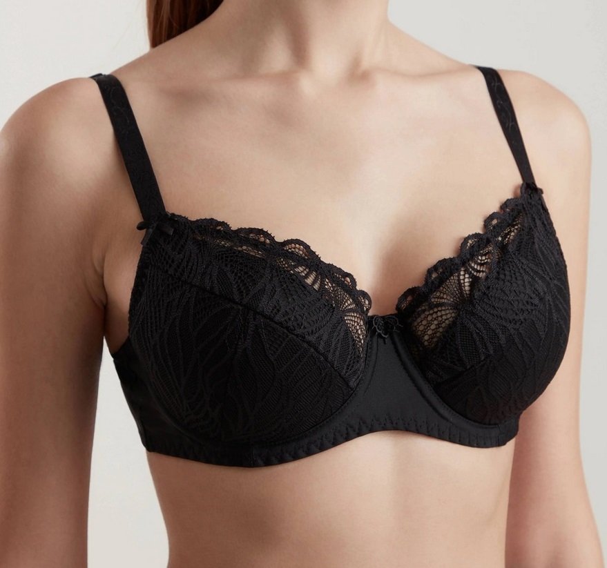 Бюстгальтер из эластичного трикотажного полотна, неэластичного трикотажного полотна и эластичного кружева. Детали чашек на подкладке из дублированного трикотажного материала, деталь ластовицы на подкладке из неэластичного трикотажного полотна.