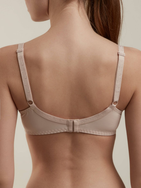 Бюстгальтер из эластичного трикотажного полотна, неэластичного трикотажного полотна и эластичного кружева. Детали чашек на подкладке из дублированного трикотажного материала, деталь ластовицы на подкладке из неэластичного трикотажного полотна. Бретели регулируются по длине сзади. Застежка на крючки и петли сзади. По выступам чашек - бантики.