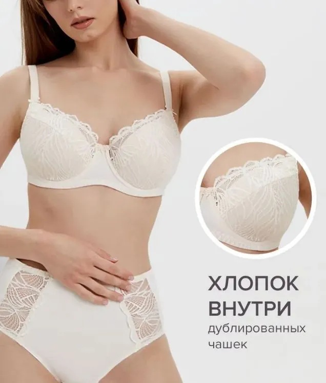 Бюстгальтер из эластичного трикотажного полотна, неэластичного трикотажного полотна и эластичного кружева. Детали чашек на подкладке из дублированного трикотажного материала, деталь ластовицы на подкладке из неэластичного трикотажного полотна. Бретели регулируются по длине сзади. Застежка на крючки и петли сзади. По выступам чашек - бантики.
