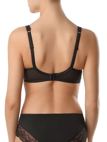 Бюстгальтер из кружева и кружевного эластичного полотна. Передняя и боковая детали чашек на подкладке из неэластичного трикотажного полотна. Боковые детали стана на подкладке из эластичного сетчатого полотна. Деталь ластовицы на подкладке из неэластичного