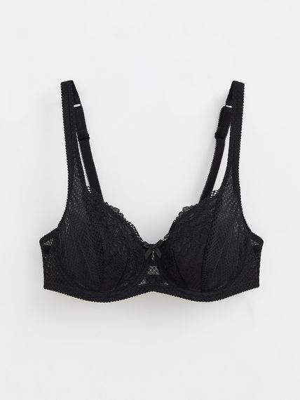 Бюстгальтер из кружева и кружевного эластичного полотна. Передняя и боковая детали чашек на подкладке из неэластичного трикотажного полотна. Боковые детали стана на подкладке из эластичного сетчатого полотна. Деталь ластовицы на подкладке из неэластичного