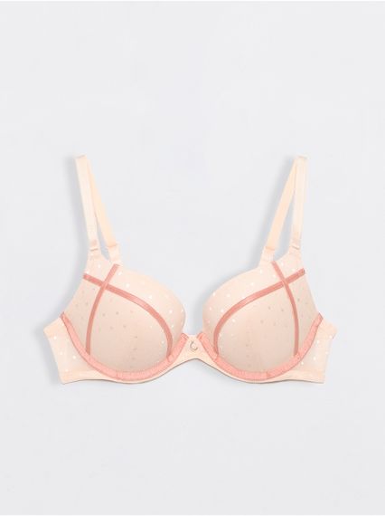 Чашка жесткая формованная, на каркасах. На детали чашек и по линии втачивания чашек настрочены отделочные эластичные тесьмы.
