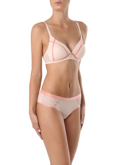 Бюстгальтер из эластичного полотна. Чашки жесткие формованные, без каркасов. На детали чашек и по линии втачивания чашек настрочены отделочные эластичные тесьмы.