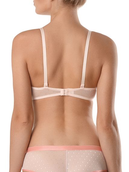 Бюстгальтер из эластичного полотна. Чашки жесткие формованные, без каркасов. На детали чашек и по линии втачивания чашек настрочены отделочные эластичные тесьмы.
