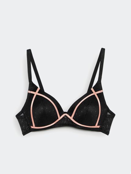 Бюстгальтер из эластичного полотна. Чашки жесткие формованные, без каркасов. На детали чашек и по линии втачивания чашек настрочены отделочные эластичные тесьмы.