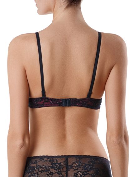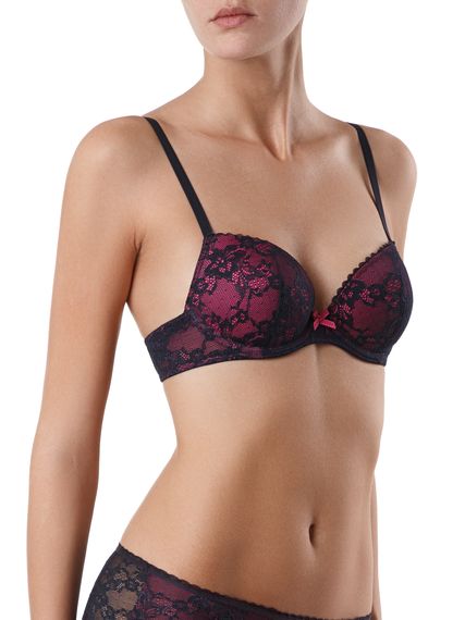 Бюстгальтер из эластичного кружевного полотна. Детали стана на подкладке из эластичного сетчатого полотна. Ластовица на подкладке из неэластичного трикотажного полотна. Чашки формованные, на каркасах.