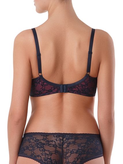 Бюстгальтер из эластичного кружевного полотна. Детали стана на подкладке из эластичного сетчатого полотна. Ластовица на подкладке из неэластичного трикотажного полотна. Чашки формованные, на каркасах. По верху чашек настрочена отделочная тесьма.