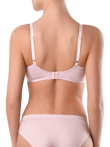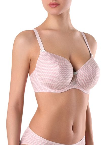 Бюстгальтер из эластичного полона. Чашки формованные, на каркасах. Ластовица на подкладке из неэластичного трикотажного полотна. Боковые детали стана на подкладке из эластичного сетчатого полотна.