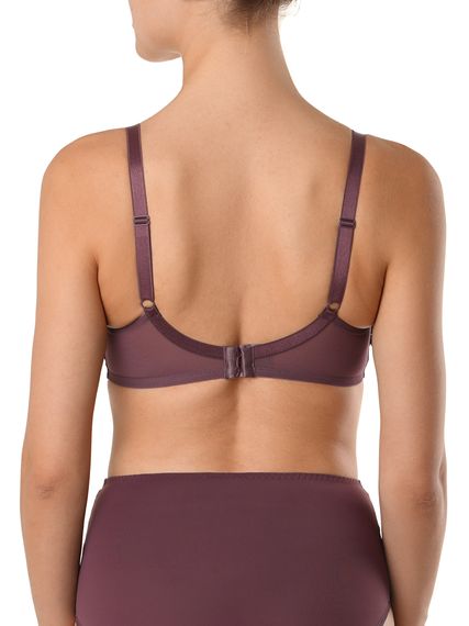 Бюстгальтер из эластичного полотна и неэластичного полотна и эластичного кружева. Чашка мягкая на каркасах, по верхнему краю настрочено эластичное кружево. Бретели регулируются по длине сзади. Застежка на крючки и петли сзади.