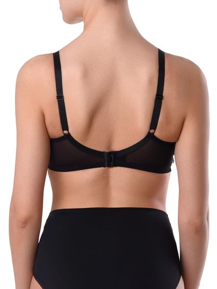 Бюстгальтер из эластичного полотна и неэластичного полотна и эластичного кружева. Чашка мягкая на каркасах, по верхнему краю настрочено эластичное кружево. Бретели регулируются по длине сзади. Застежка на крючки и петли сзади.