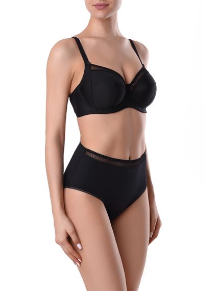 Бюстгальтер из эластичного полотна и неэластичного полотна и эластичного кружева. Чашка мягкая на каркасах, по верхнему краю настрочено эластичное кружево. Бретели регулируются по длине сзади. Застежка на крючки и петли сзади.