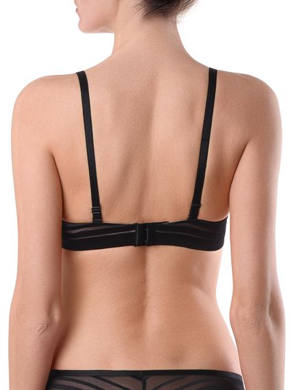 Бюстгальтер из эластичного трикотажного полотна и эластичного кружева. Детали стана на подкладке из эластичного сетчатого трикотажного полотна. Ластовица на подкладке из неэластичного трикотажного полотна. Чашки формованные, на каркасах. Бретели съёмные,
