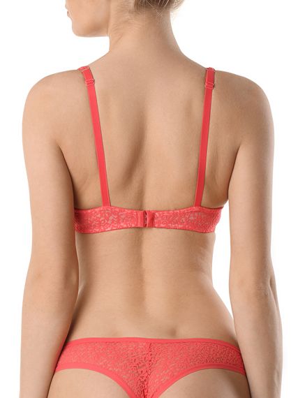 Бюстгальтер из эластичного кружевного полотна. Детали стана на подкладке из эластичного сетчатого трикотажного полотна. Ластовица на подкладке из неэластичного трикотажного полотна. Чашки на каркасах. Бретели регулируются по длине сзади.