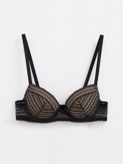 Бюстгальтер из эластичного кружева. Детали чашек на подкладке из ламинированного полотна. С изнаночной стороны чашки из неэластичного х/б полотна обработан «карман» для вкладыша. Чашка на каркасах. Бретели регулируются по длине сзади. Застежка на крючк