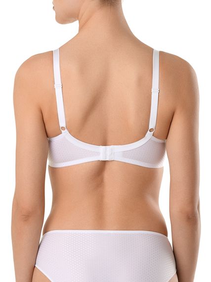 Бюстгальтер из эластичного полотна. Чашка жесткая, формованная, на каркасах. Верхний срез чашки и срез проймы окантованы тесьмой. Бретели регулируются по длине сзади. Застежка на крючки и петли сзади. На уголки чашек настрочены бантики.