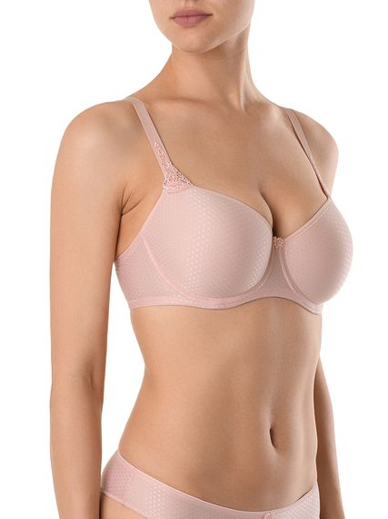 Бюстгальтер из эластичного полотна. Чашка жесткая, формованная, на каркасах. Верхний срез чашки и срез проймы окантованы тесьмой. Бретели регулируются по длине сзади. Застежка на крючки и петли сзади. На уголки чашек настрочены бантики.