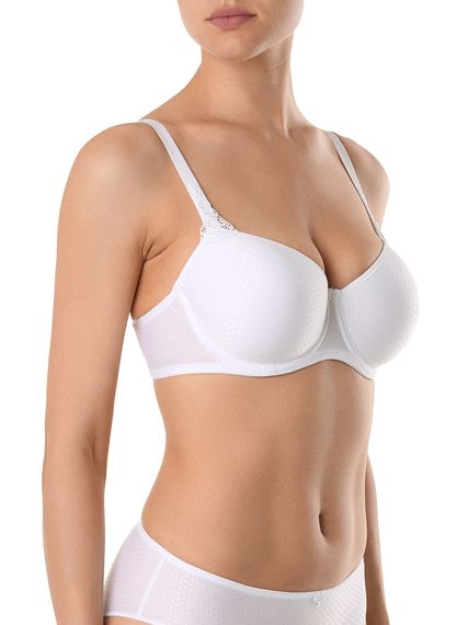 Бюстгальтер из эластичного полотна. Чашка жесткая, формованная, на каркасах. Верхний срез чашки и срез проймы окантованы тесьмой. Бретели регулируются по длине сзади. Застежка на крючки и петли сзади. На уголки чашек настрочены бантики.