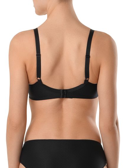 Бюстгальтер из эластичного полотна. Чашка жесткая, формованная, на каркасах. Верхний срез чашки и срез проймы окантованы тесьмой. Бретели регулируются по длине сзади. Застежка на крючки и петли сзади. На уголки чашек настрочены бантики.