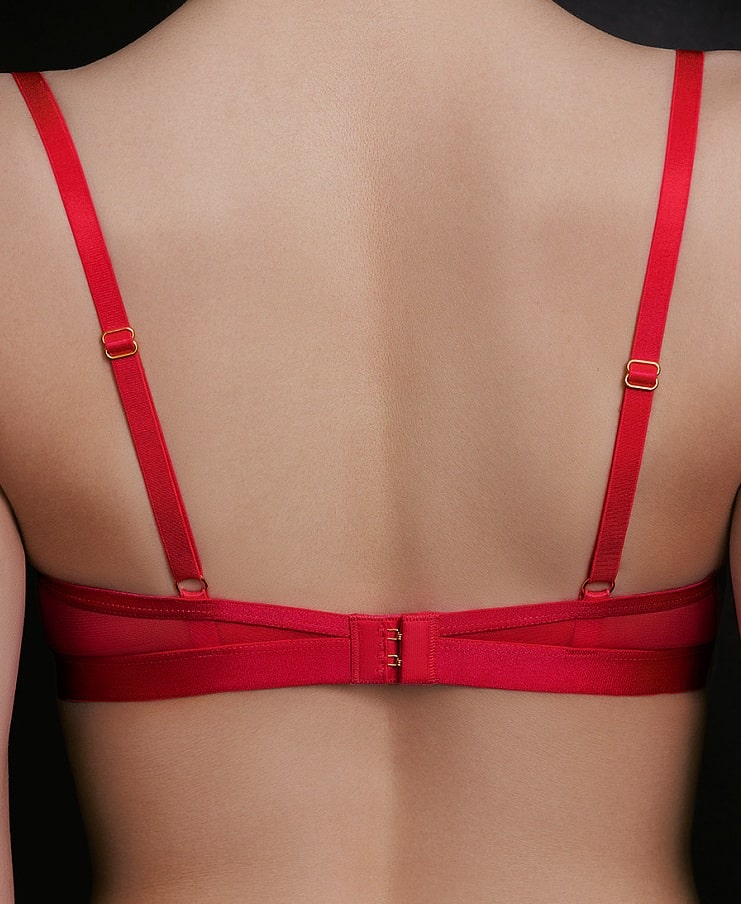 Бюстгальтер «триангл» из эластичной сетки с уплотненными формованными чашками без косточек. С акцентными лентами по краям. Эффектно подчеркивает декольте, превосходно облегает и обеспечивает комфортную поддержку благодаря регулируемым бретелям и удобной застежке на два крючка.