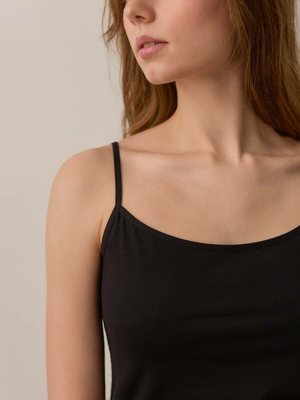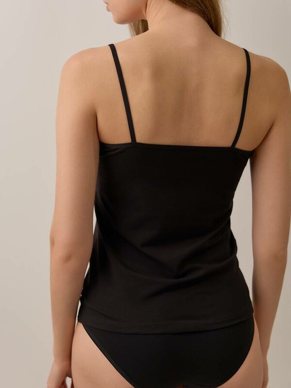 Топ женский из эластичного трикотажного полотна. Верх изделия обработан окантовкой переходящей в нерегулируемые бретели.