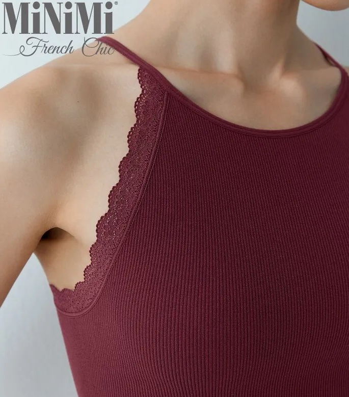 Комфортная укороченная майка MINIMI Mi 1221S French Chic в рубчик на тонких бретелях. Пройма и низ обработаны ажурным кружевом с изящным цветочным рисунком. Изготовлена по бесшовной технологии из мягкой микрофибры, которая отлично пропускает воздух и обладает нежной текстурой. Хорошо сохраняет форму и цвет. Майка превосходно облегает и приятно ощущается на теле благодаря отсутствию боковых швов.