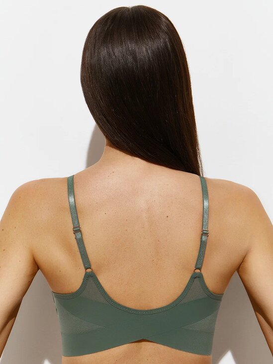 Стильный топ на тонких регулируемых бретелях со съемными мягкими формованными вкладышами и оригинальным дизайном спины. Эффектно подчеркивает грудь и придает ей изящную округлую форму. Изготовлен из гладкой микрофибры с добавлением эластичной сетки по прогрессивной технологии с использованием плоского клеевого шва и термоклеевой обработки края. Материал обладает высокой воздухопроницаемостью, приятно ощущается, хорошо сохраняет форму и цвет. Передняя часть топа выполнена на подкладке и дополнена съемными вкладышами. Топ превосходно облегает и обеспечивает комфортную поддержку. Необычный дизайн спины смотрится оригинально и привлекает внимание.