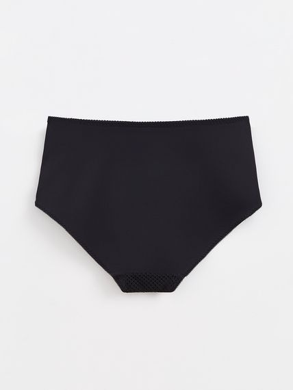 Трусы женские со высокой линией талии. Выполнены из эластичного трикотажного кружева, эластичного трикотажного кружевного полотна и эластичного трикотажного плотна. Передняя деталь на подкладке из эластичного трикотажного сетчатого полотна. Подкладка ласт