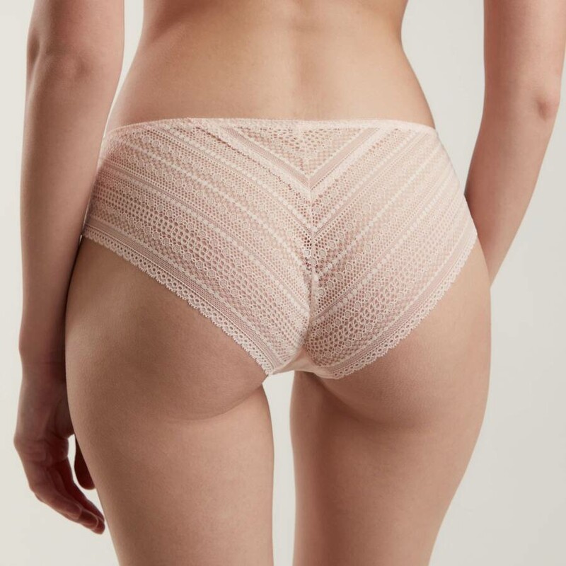 Трусы слип со средней линией талии Vintage RP3074 выполнены из кружева с ажурным орнаментальным рисунком и прямым краем. Современный образ, безупречная посадка на фигуре и абсолютный комфорт – визитная карточка модели.