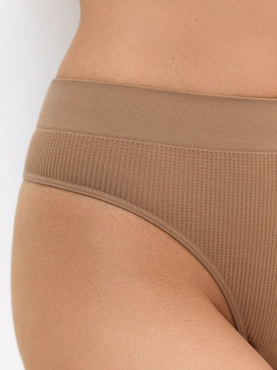 Бесшовные трусы-стринги из микрофибры с вафельным плетением, с высокой линией талии. Материал в составе обладает нежной текстурой, приятно ощущается на теле, превосходно пропускает воздух, впитывает влагу, хорошо сохраняет форму и цвет. Отсутствие боковых