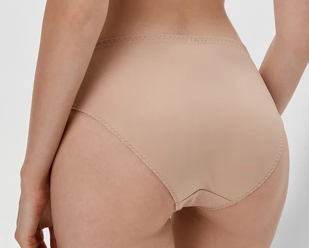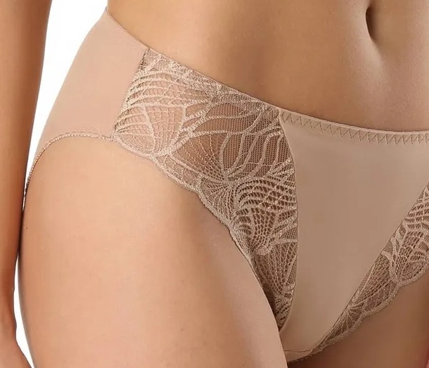 Трусы женские со средней линией талии. Выполнены из однотонного эластичного основовязаного трикотажного полотна и эластичного кружева. Подкладка ластовицы – из трикотажного х/б полотна.