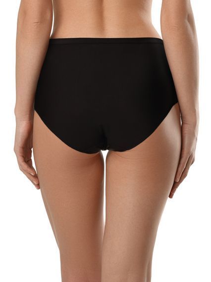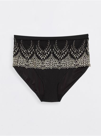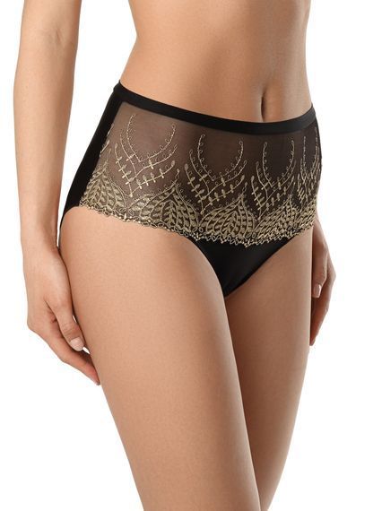 Трусы женские с высокой линией талии. Выполнены из трикотажного эластичного полотна, трикотажного эластичного сетчатого полотна и вышивки на эластичной сетке. Подкладка ластовицы – из трикотажного х/б полотна.
